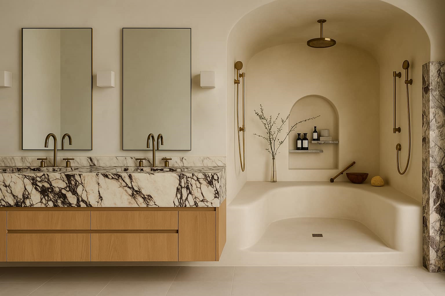 Spaces anchored in mineral materials, sculpted by hand, where each surface tells of refinement in its simplest expression.