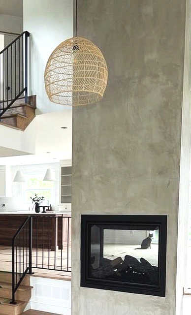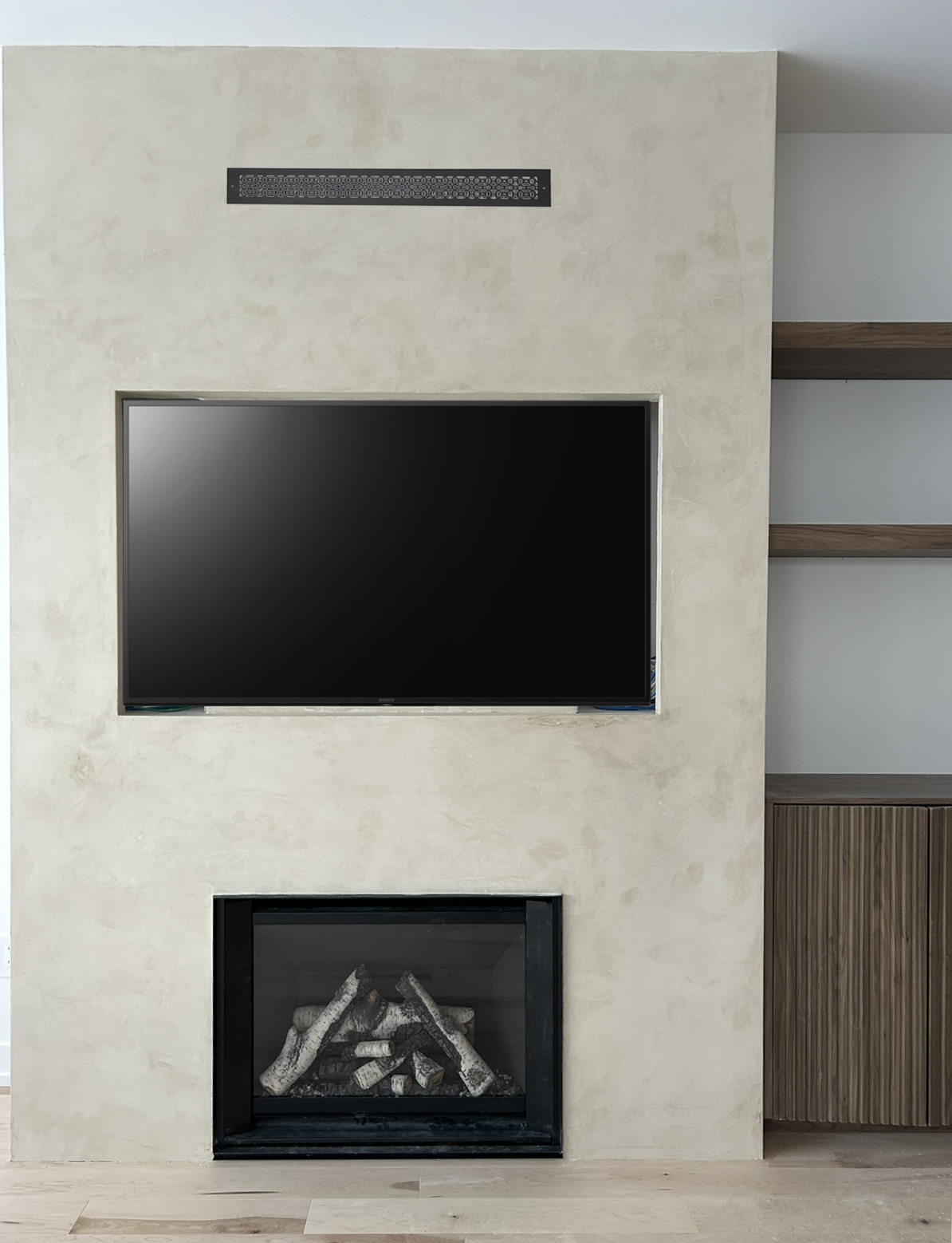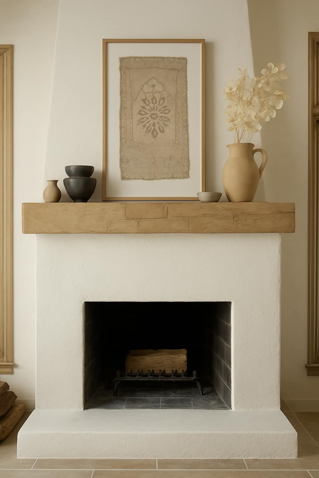 L'enduit à la chaux enveloppe les manteaux de foyer d'une douceur minérale, avec des effets nuancés et une finition lisse.