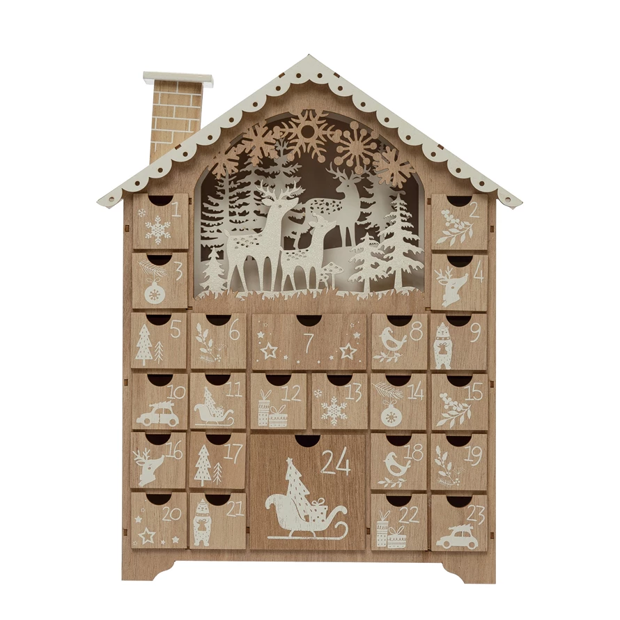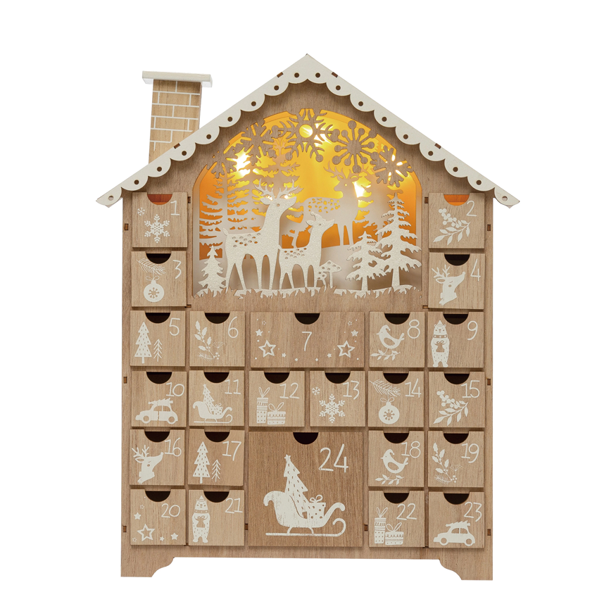 Calendrier de l'Avent maison en bois avec 24 tiroirs et lumière LED, naturel et blanc (nécessite 2 piles AAA)